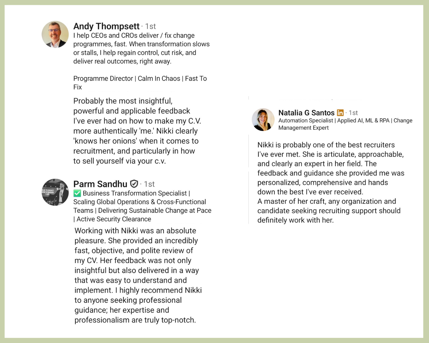This approach allows you to see your CV through a recruiter’s eyes, understand why certain sections aren’t landing, and make informed changes with confidence rather than guesswork. At this price point, the review is designed to be practical, focused and actionable, rather than a full consultation or coaching session.